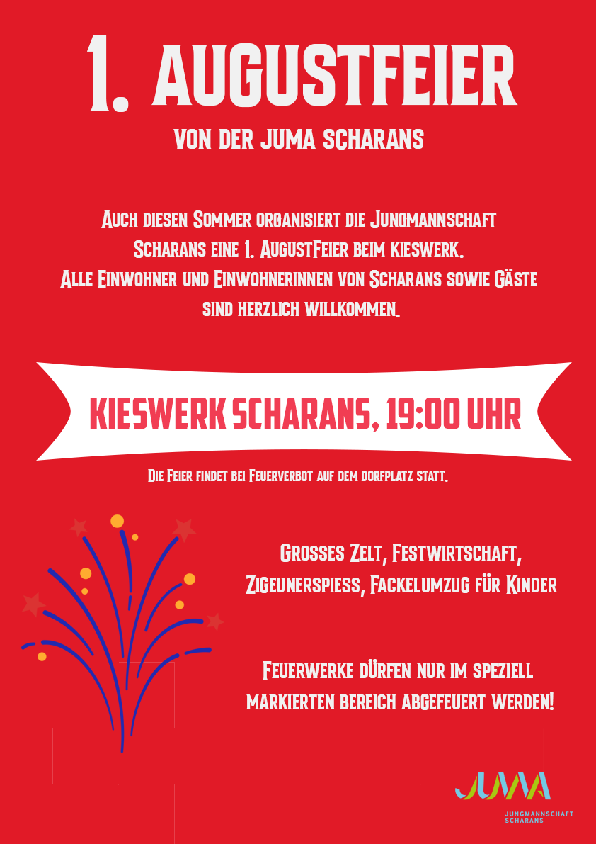 Auch diesen Sommer organisiert die Jungmannschaft Scharans eine 1. Augst Feier beim Kieswerk um 19.00 Uhr. Alle Einwohner und Einwohnerinnen von Scharans sowie Gäste sind herzlich willkommen. Auf dem Gemeindegebiet Scharans ist das Ablassen von Feuerwerken, ausserhalb des dafür bezeichneten Bereiches im Kieswerk, untersagt.